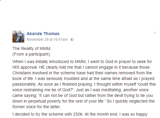 This is according to Facebook user, Akande Thomas who shared how God rejected his tithe from MMM earnings and clearly told him that the names of Christians involved in the scheme have been removed from the book of life.
